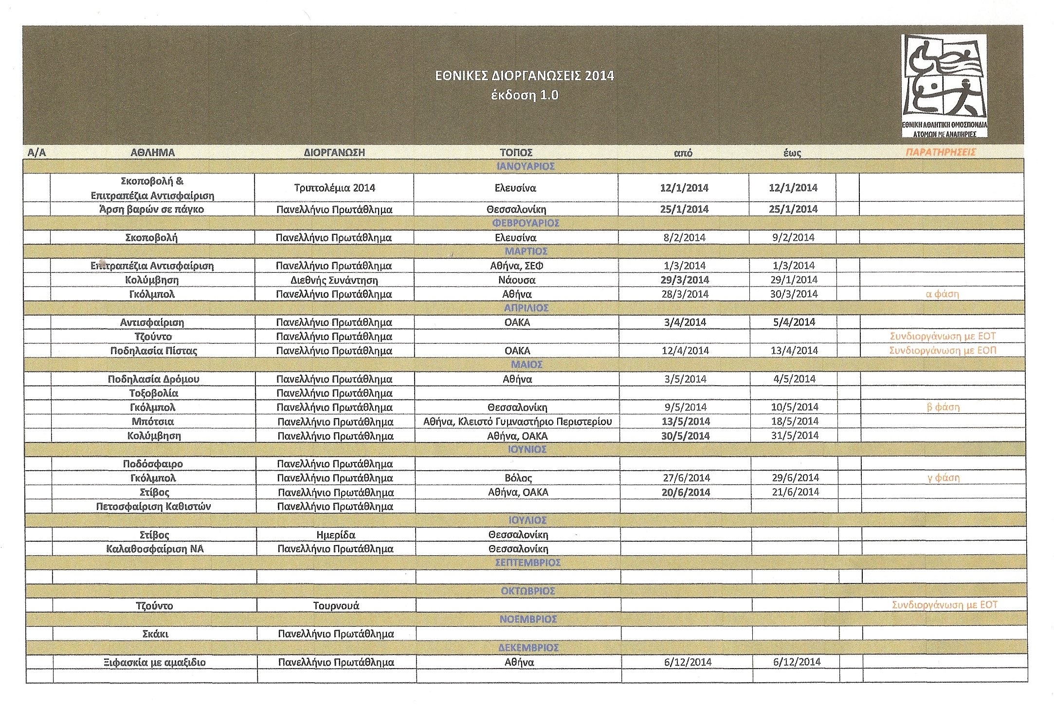 Γνωστοποιήθηκε από την Ε.Α.Ομ.Α.μεΑ. το ημερολογιακό πρόγραμμα των Πανελληνίων Πρωταθλημάτων Α.μεΑ. 2014. Μεταξύ άλλων τα Πανελλήνια Πρωταθλήματα για τα παρακάτω αναφερόμενα αθλήματα θα γίνουν ως εξής: