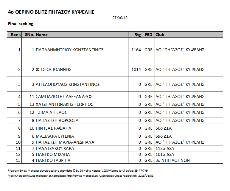 Η τελική κατάταξη των σκακιστών και σκακιστριών στο 4ο θερινό σκακιστικό τουρνουά BLITZ του Α.Ο. Πήγασος Κυψέλης (της 27/6/2018) έχει ως εξής: