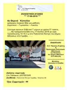Το Σωματείο μας Α.Ο. Πήγασος Κυψέλης σε συνεργασία με τον Οργανισμό Πολιτισμού, Αθλητισμού και Νεολαίας του Δήμου Αθηναίων (Ο.Π.Α.Ν.Δ.Α.) διοργανώνουν την Κυριακή 17/6/2018 το 4ο Θερινό Κύπελλο γρήγορου Σκακιού Blitz για μαθητές Δημοτικού – Γυμνασίου – Λυκείου στη Γκράβα.