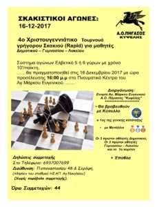 Ο εξαίρετος σκακιστής μας ΝΙΚΟΛΑΟΣ ΤΡΑΓΟΥΔΑΡΑΣ με το απόλυτο 6 νίκες στους 6 αγώνες θριάμβευσε στο 4ο Χριστουγεννιάτικο Παιδικό Κύπελλο γρήγορου Σκακιού 2017 που διοργάνωσε και πάλι η ομάδα μας Α.Ο. ΠΗΓΑΣΟΣ ΚΥΨΕΛΗΣ με μεγάλη επιτυχία στις 16/12/2017 στο Πνευματικό Κέντρο του Αγίου Μάρκου Ευγενικού Κάτω Πατησίων με νέο μάλιστα ρεκόρ συμμετοχών (38 σκακιστών και σκακιστριών)